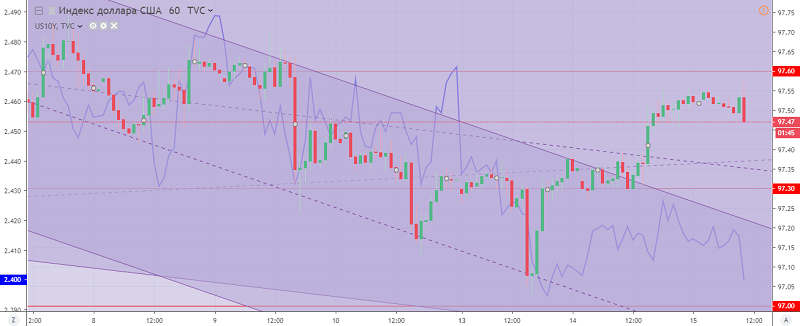 Fig. The US dollar index chart. The current price is 97.50 (10-year government bonds yield is the blue line)