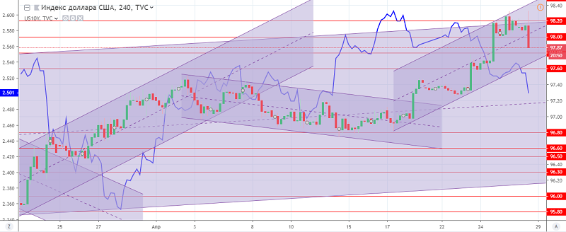 Fig. The US dollar index H4 chart. The current price is 97.90 (10-year government bonds yield is the blue line)