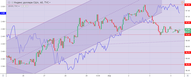 The dynamics of the American dollar at the trading on Wednesday remains a downward, limited support level of 97.00, indicating a downside potential with the renewal of the lows and support breakthrough. Resistance is located at the level of 97.20-30, fixing above which will give hope for the update of the uptrend.