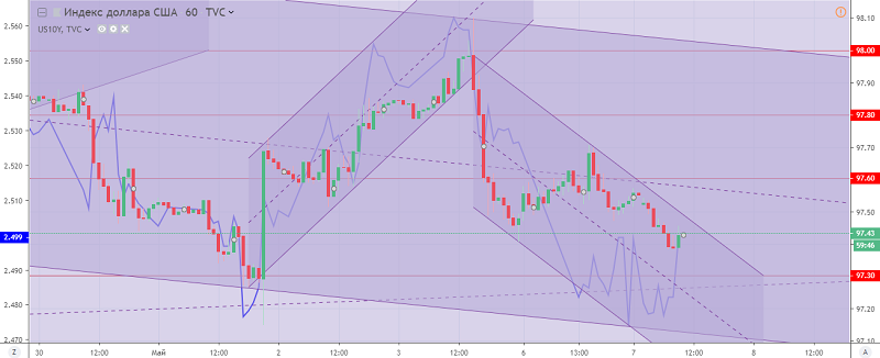 Despite the fact that the main strengthening of the US dollar on Monday was traced against commodity currencies, the main competitors of the dollar closed Monday’s trading at the opening of the week, pointing to the short-term growth of the dollar and the impulsive nature of Monday’s movement. The US dollar index, after a short correction, updated a Friday’s low. This he confirmed the downward trend, which is limited to support levels: 97.30 and 97.10.