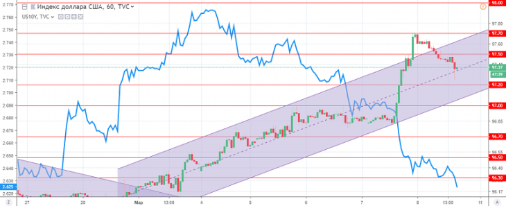 At the end of the day, the US dollar index closes with a decrease, which was caused by a correction after growth at the start of the day, and in the second half of the day, by ambiguous employment da in the United States. As a result, the US dollar index remains in the correction phase after growth, limited to support levels: 97.20 and 97.00 and an uptrend.