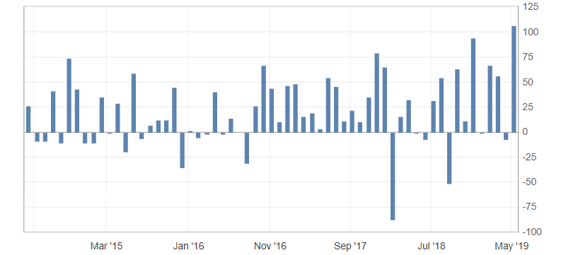- Change in employment (Apr), fact 106.5K, forecast 10.0K.