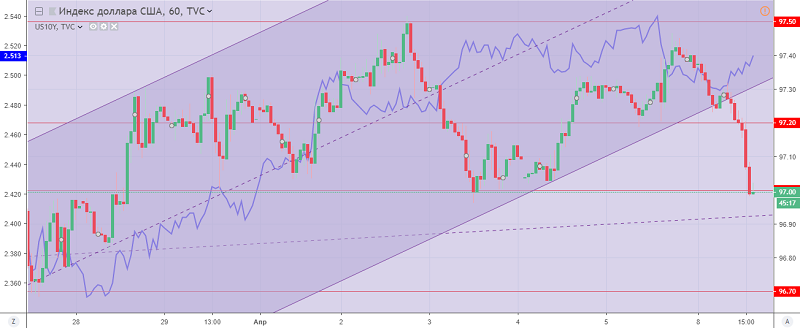 As a result, the US dollar index collapsed against a basket of competitors for psychological support of 97.00. This level is a significant support for the American dollar, where a rebound is expected. In the conditions of preserving political risks and breaking through support of 97.00, an American dollar may be on the way of a more significant reduction. Support levels are: 97.00 and 96.80-70, resistance: 97.20-30.