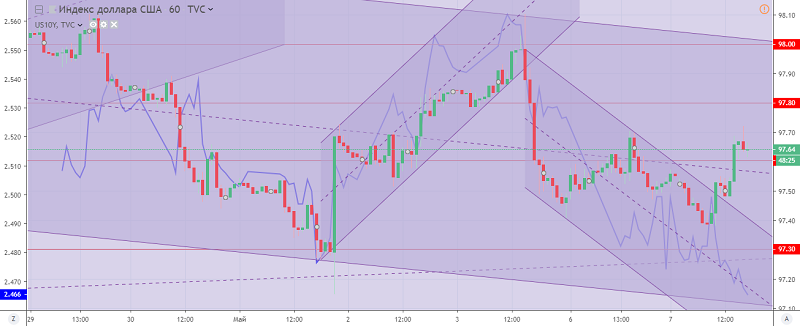 Fig. 3. The US dollar index chart. The current price is 97.70 (10-year government bonds yield is the blue line)