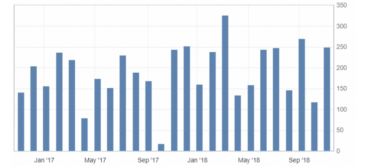 - Private nonfarm payrolls (October), fact 246K, forecast 183K.