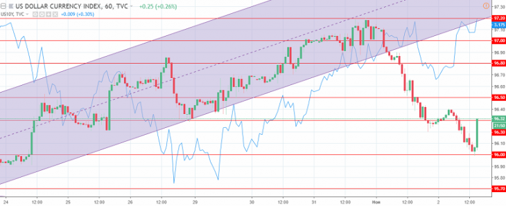 Fig. 2. The US dollar index chart. The current price is 96.30 (10-year government bonds yield is the blue line)