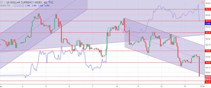 Fig. 2. The US dollar index chart. The current price is 94.60 (10-year government bonds yield is a blue line)