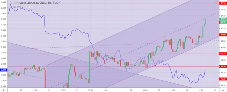 After the US dollar accelerated growth against a basket of competitors on ambiguous data on the US GDP, the US dollar index updated the significant resistance level of 97.20-30. Thus, the dollar index was in significant overbought against the majority of its main competitors. The main growth of the American dollar fell against the safe haven assets as gold and the yen, which was also due to the growth of the US state bonds profitability  and optimism in stock markets.
