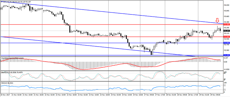 В результате индекс доллара продолжил укрепление к значимому уровню сопротивления 93.400, верхняя граница нисходящего канала. Несмотря на публикацию позитивных данных по США, общие риски относительно налоговой реформы и нового президента ФРС продолжают сохраняться. Так, трёхдневное восходящее движение по индексу доллара США остаётся в большей степени коррекционным. И существует высокая доля вероятности возобновления нисходящего тренда по американцу.
