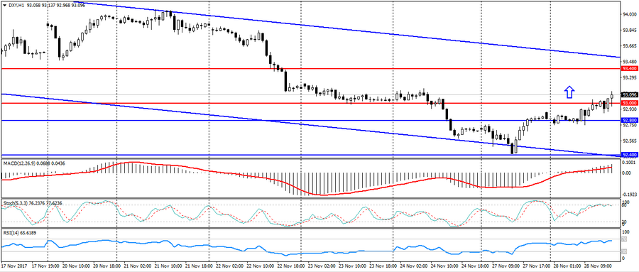 Во вторник, 28 ноября, индексу доллара удалось укрепиться на 0,10% против основной корзины мировых валют, что было вызвано коррекцией после снижения и публикацией данных по доверию потребителей в США, но сдерживающим фактором восстановления американца выступили данные по сальдо торгового баланса. Дополнительным фактором к укреплению американца стал повсеместный рост оптимизма на рынке, который выразился укреплением мировых фондовых индексов.