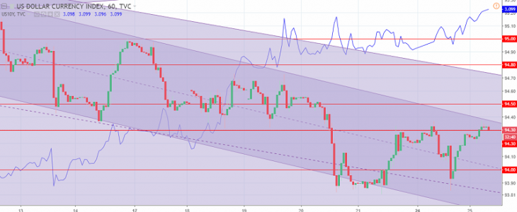 График индекса доллара США. Текущая цена – 94.30 (доходность 10-ти летних гос. облигаций – синяя линия)
