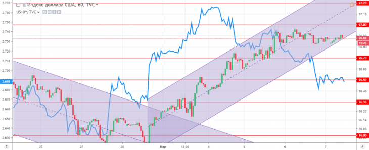 График индекса доллара США. Текущая цена – 96.90 (доходность 10-ти летних гособлигаций – синяя линия)