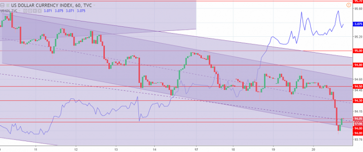 График индекса доллара США. Текущая цена – 94.00 (доходность 10-ти летних гос. облигаций – синяя линия)
