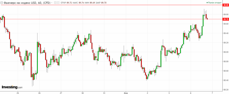 Во вторник, 6 февраля, американская валюта продолжила рост на общем снижении фондовых индексов. Поводом к укреплению американца послужил рост доходности гос. облигаций, которые после снижения возобновили рост. Также американец получил поддержу на фоне сохранения негативных настроений на рынке и бегства инвесторов от рисков.