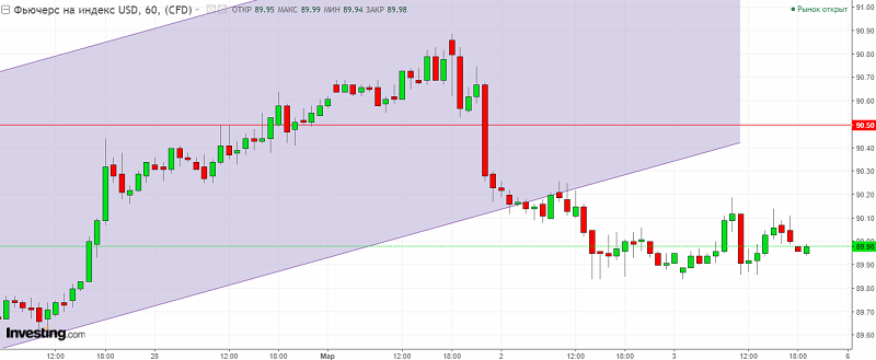 При этом сам индекс доллара США продолжает ограничиваться уровнями пятницы, тем самым формируя боковой канал от 89.90-80 до 90.20.