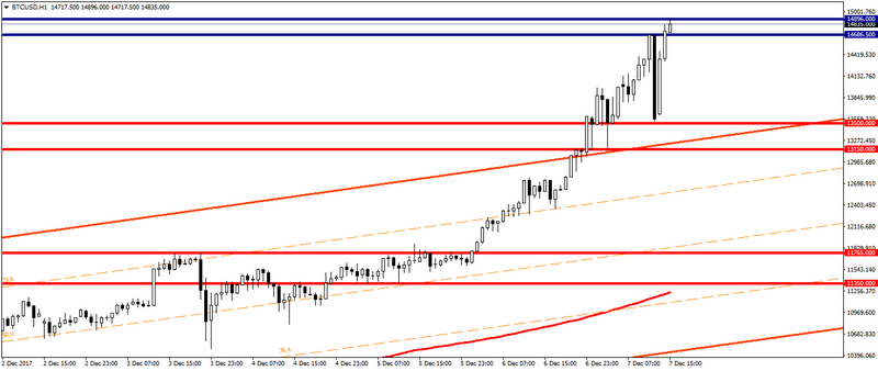 Поле того как цена биткоина достигла отметки $14 686.500, участники рынка перешли к фиксации прибыли, что привело к снижению цены более чем на $1 100.00, получив поддержку в районе $13 500.00, после чего цена возобновила рост и достигла исторического максимума, тем самым оправдав мои утренние ожидания. См. «Биткоин бьет рекорды. Алькоины теряют позиции».