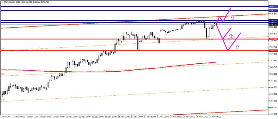 Технический анализ: После утреннего восстановления, рост цены биткоина замедлился вблизи значимой области сопротивления $8200.00-8250.00. В случае дальнейшего роста, следующий максимум ожидаю в районе $8500.00-$8600.00. Основными уровнями поддержки выступают отметки $7790.00; $7500.00.