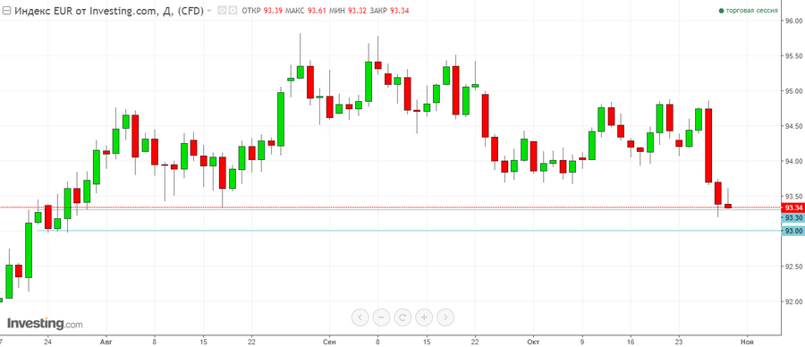 В результате подобную слабую статистику по Германии можно расценивать ка фундаментальный фактор к возобновлению нисходящей динамики по евро. Ожидания относительно пары EUR/USD https://esterholdings.com/ru/2017/10/30/eur-usd-today-215/. Относительно индекса евро всё не так однозначно, поскольку индекс евро против основной корзины мировых валют нащупал поддержку на уровне 93.30-20. Пробить данный уровень без значимой коррекции продавцам будет сложно. Психологическим уровнем поддержки выступает отметка 93.00.