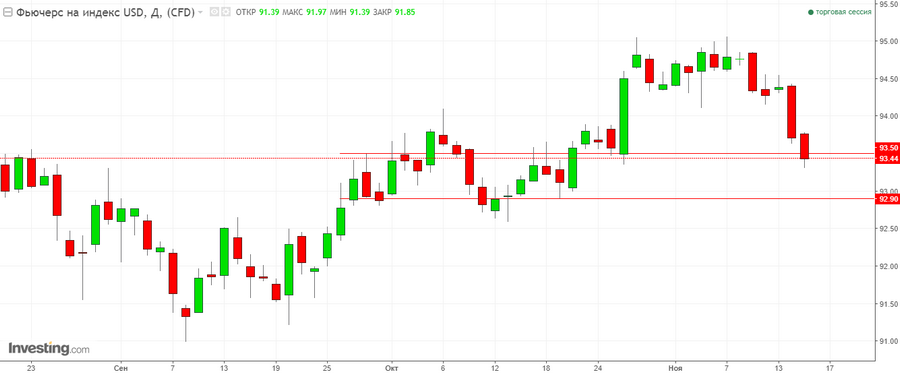 В итоге индекс доллара остаётся торговаться возле уровня 93.400-500, закрепление ниже которого откроет дорогу к отметкам 93.000-92.900. Также стоит отметить, что основное снижение доллара США прослеживается против активов безопасной гавани, что вызвано негативными настроениями рынка.