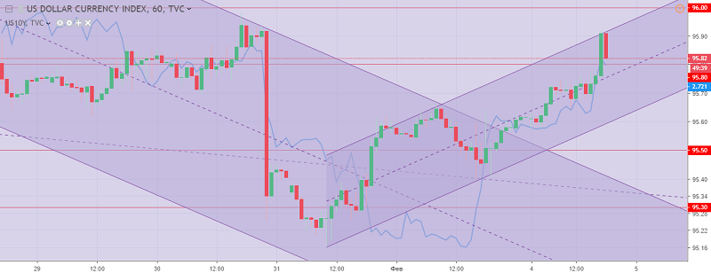 Рис. 2. График индекса доллара США. Текущая цена – 95.80 (доходность 10-ти летних гос. облигаций – синяя линия)