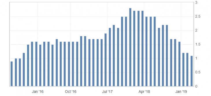 Данные по ВВП еврозоны за четвёртый квартал замедлились в годовом исчислении, указав на негативную динамику еврозоны. При этом реакция евро на данную статистику остаётся весьма сдержанной из-за ожидания результатов заседания ЕЦБ и последующей пресс-конференции. Показатель ВВП (г/г) еврозоны остаётся в нисходящей динамике, отвечая минимальным значениям средины 2015 года.