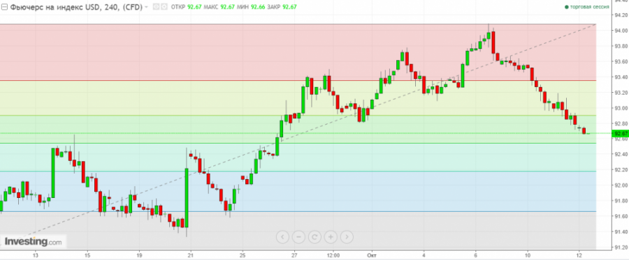 В результате весьма пессимистических настроений индекс доллара ускорил снижение против основной корзины мировых валют, торгуется возле минимумов трёх недель, оставаясь ограниченным уровнями поддержки 92.50 и 92.20. Несмотря на почти полутора недельное снижение, индекс доллара оставляет за собой потенциал к росту, что будет указывать на изменение глобального нисходящего тренда, который прослеживался сначала 2017 года.
