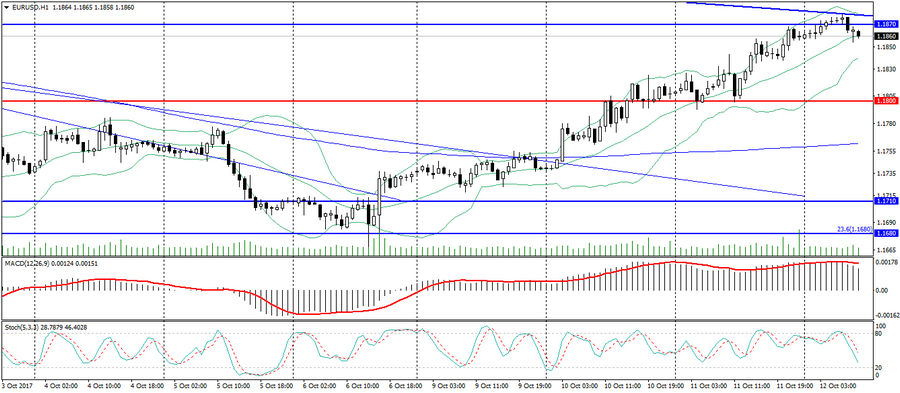 После роста пары EUR/USD на азиатской сессии рынок перешёл в фазу коррекции. Зона 1.1870-80 выступает значимым сопротивлением, которым отвечает уровень сопротивления, проведён по максимум текущего года и 20 сентября. Также данная зона отвечает уровню Фибо 50.0 от максимума сентября до минимума октября. Поэтому преодолеть рынку данную отметку будет сложно.