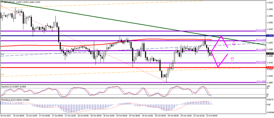 Сегодня ожидаю дальнейшего движения цены во флэте между уровнями 23,6 и 50,0 по Фибоначчи на Н1, которым отвечают значения 1,3144 и 1,3210 соответственно.