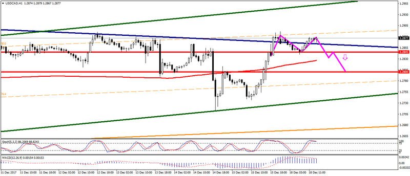 Технический анализ: Благодаря пятничному ралли доллара США, цена пары USD/CAD пытается закрепиться выше линии сопротивления нисходящего канала на D1, что является сигналом возможного усиления тренда в краткосрочном периоде. На данный момент на графике Н1 формируется «Двойная Вершина», в результате отработки которой и закрепления цены ниже отметки 1,2845, стоит ожидать снижения цены к отметке 1,2800,00.