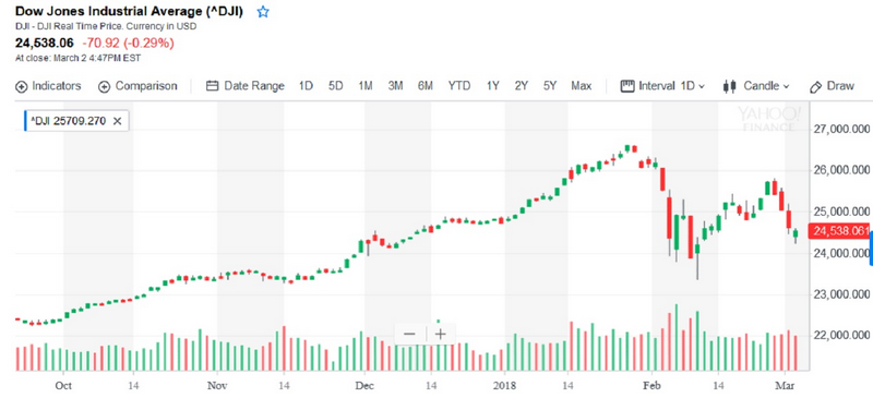 Мы можем изучить влияния этих новостей на финансовый рынок, опираясь на объективные показатели фондового рынка. Начнем, пожалуй, с Доу-Джонса (рисунок 1).