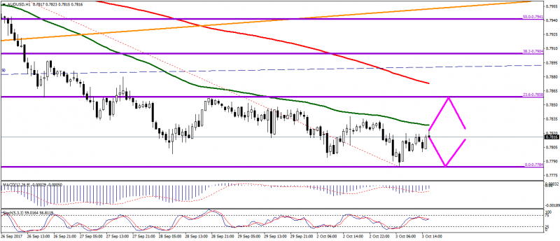 Технический анализ: После значительного снижения пары AUD/USD за последние полторы недели сентября, пара перешла к боковому движению с уровнем поддержки в районе 0,7790-0,7785 (уровень 0,0 по Фибоначчи на Н1) и уровнем сопротивления в районе 0,7850-0,7860 (уровень 23,6 по Фибоначчи на Н1)