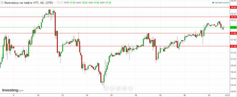 - Ближайшие уровни сопротивления: для WTI – 58.30 и 58.60$ за баррель, для Brent – 65.00 и 65.80$ за баррель.