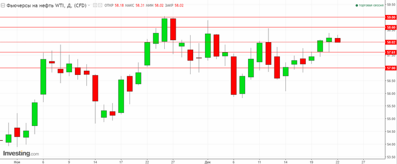 • Ближайшие уровни сопротивления: для WTI – 58.60 и 59.00$ за баррель, для Brent – 65.00 и 65.60$ за баррель.