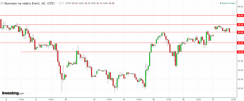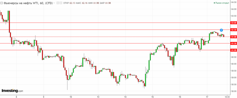 - Ближайшие уровни сопротивления: для WTI – 62.50 и 63.00$ за баррель, для Brent – 65.50 и 66.00$ за баррель.