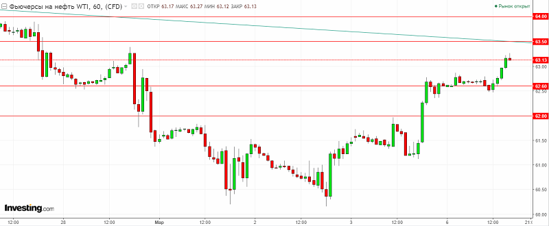 - Ближайшие уровни сопротивления: для WTI – 63.50 и 64.00$ за баррель, для Brent – 66.50 и 67.00$ за баррель.