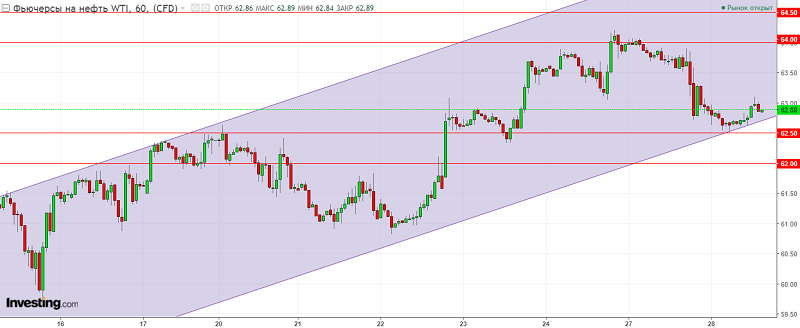 График WTI. Текущая цена – 62.80$