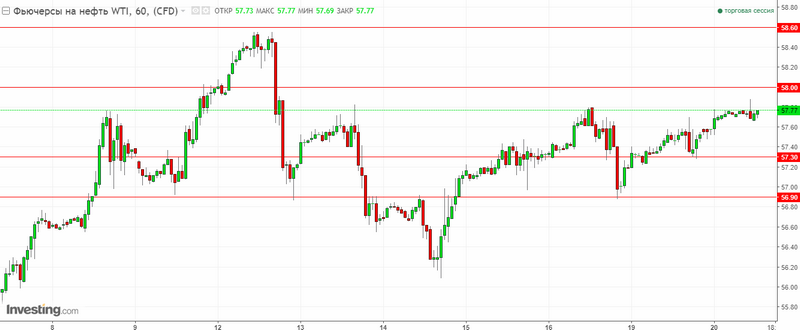 - Ближайшие уровни сопротивления: для WTI – 58.00 и 58.60$ за баррель, для Brent – 63.40 и 65.50$ за баррель.