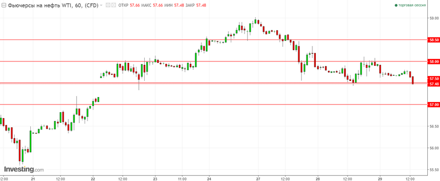 - Ближайшие уровни сопротивления: для WTI – 58.00 и 58.50$ за баррель, для Brent – 63.00 и 63.50$ за баррель.