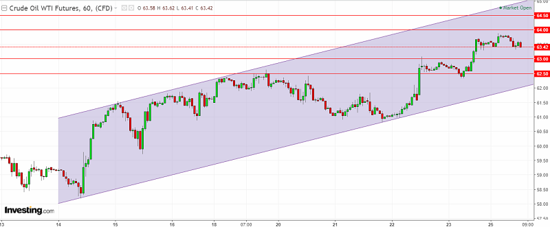 График WTI. Текущая цена – 63.40$