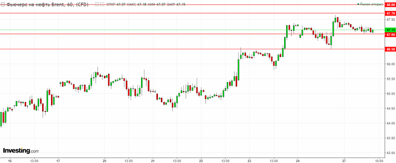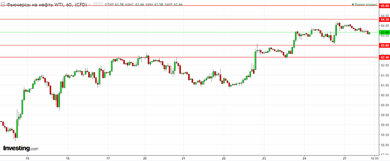 - Ближайшие уровни сопротивления: для WTI – 64.30 и 65.00$ за баррель, для Brent – 67.70 и 68.00$ за баррель.