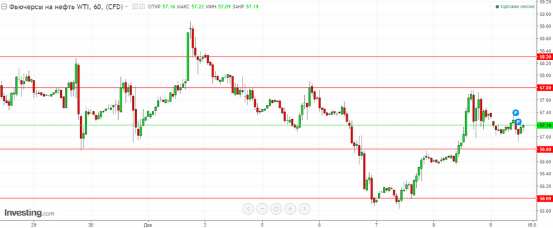 - Поддержкой выступают отметки: для WTI – 56.80 и 56.00$ за баррель, для Brent – 63.00 и 62.20$ за баррель.