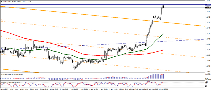 Основные фондовые индексы Европы снижаются в ходе торгов среды. В среднем индексы снизились на -0,80%, что позволяет европейским валютам укреплять свои позиции против доллара США. Немецкий DAX снизился на 1,32%. См. котировки https://ru.tradingeconomics.com/stocks, на фоне чего единая валюта сохраняет позиции против доллара США вблизи дневного максимума на отметке 1,1851.