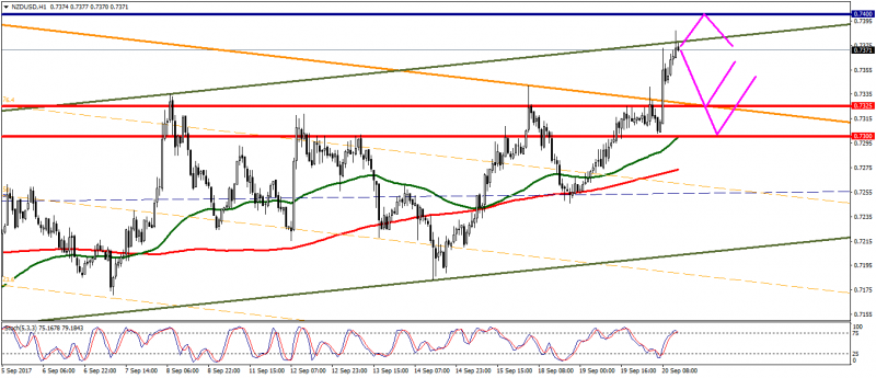 В ходе торгов среды пара NZD/USD протестировала сопротивление восходящего канала на Н1, что говорит о хорошем потенциале дальнейшего восходящего движения. На данный момент основным сопротивлением выступает психология 0,7400, от которой стоит рассматривать продажи по паре. Также мувинги Stochastic Oscilliator находятся выше уровня 75 и говорят о том, что пара входит в зону перекуплености, в связи с чем вскоре стоит ожидать коррекционного движения по паре, что подразумевает продажи по данному инструменту. Ближайшие уровни поддержки рассматриваю у отметок 0,7325-0,7300, которые и являются основными целями при продаже пары.
