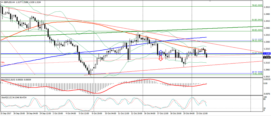 Цена остаётся возле уровня 1.3180 (Фибо. 23.6 от максимума сентября), тем самым сохраняя некоторую неопределённость между сохранением коррекционного движения и возвратом к росту. Закрепление цены ниже 1.3180-70 откроет дорогу к поддержке 1.3100, пробитие которой, в свою очередь, к 1.3030. В противном случае сопротивлением выступает отметка 1.3230-50 и 1.3270.