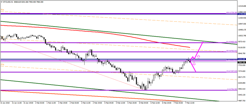 Технический анализ: Цена Биткоина выросла к отметке $8 332.530, которая находится в области уровня 38,2 линий Фибоначчи на Н1, при этом сохранение цены ниже данного уровня будет говорить о сохранении нисходящего тренда.