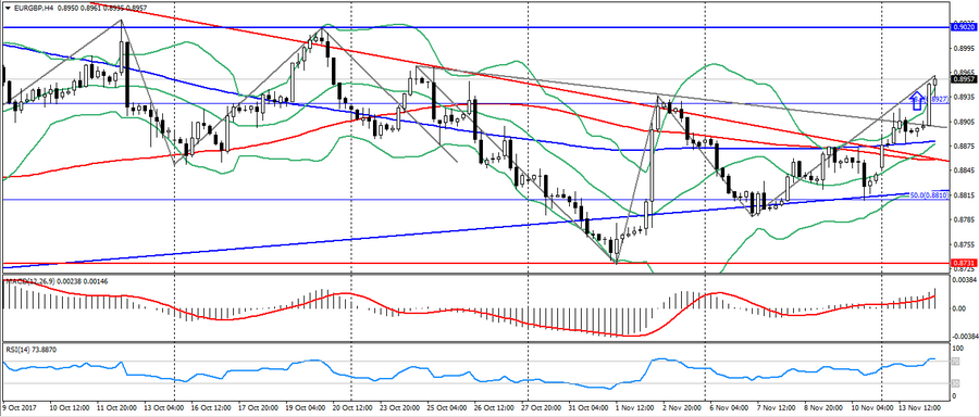 В результате фундаментальных факторов паре EUR/GBP удалось пробить основную зону сопротивления 0.8910-40, в результате чего образовалась перекупленность. Поэтому возможен откат к уровням поддержки, после чего стоит ожидать возобновления роста данного кросса. Минимальна цель расположилась на уровне 0.9020, максимум октября, вторая – 0.9070-90. Поддержкой выступают уровни: 0.8900 и 0.8870.