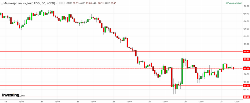 При этом индекс доллара США продолжает торговаться в боковом тренде, ограничиваясь торговым диапазоном четверга прошлой недели. При этом общий нисходящий тренд по американкой валюте продолжает сохраняться, что в дальнейшем может указывать на возобновление нисходящей динамики. Уровни поддержки: 88.50 и 88.20, сопротивления: 89.20 и 89.40.