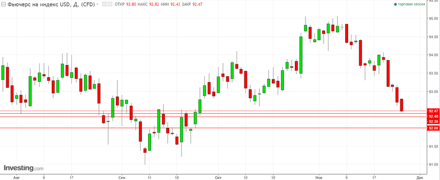 В данный момент дальнейшее снижение индекса доллара ограничивается уровнем поддержки 92.400-300 и значительной перепроданностью. В условиях негативного открытия фондовых площадок США давление на американца может усилиться и открыть дорогу к уровню 92.000.