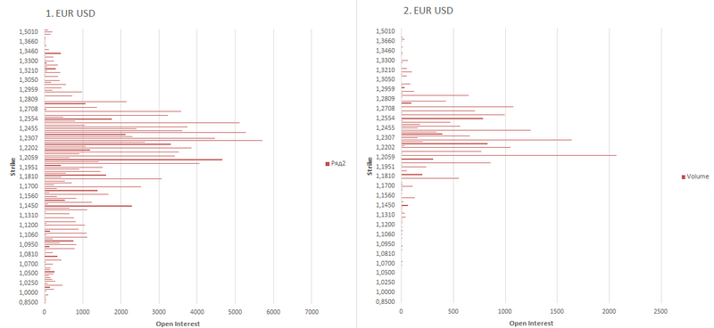 EUR USD Общее распределение интересов (1) и объёмов (2)