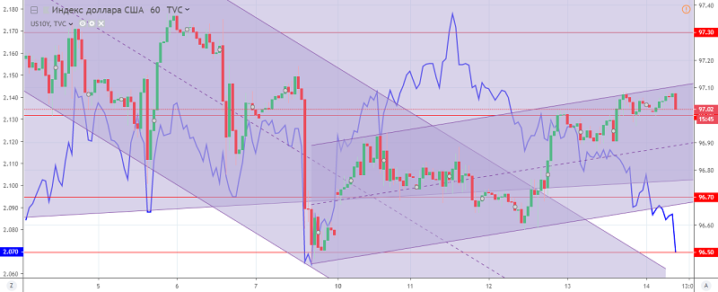 Мал. Графік індексу долара США. Поточна ціна – 97.00 (прибутковість 10-ти річних держоблігацій США – синя лінія)
